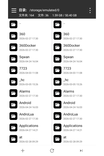 采用双栏并排显示设计,左右栏可分别浏览不同文件路径,文件在两栏间拖拽即可完成复制或移动,归档、解压操作同步进行,提升效率。