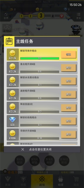 2、主线任务提供稳定金币与钻石收益,完成目标可解锁炮塔与技能相关内容。