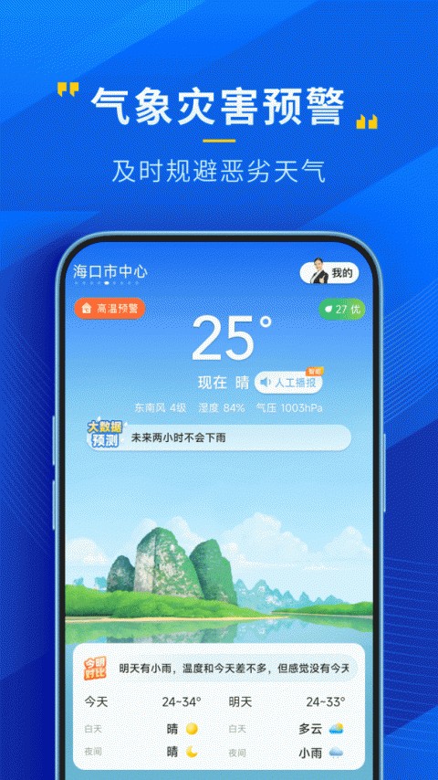 1,降雨预警:采用分钟级高频天气监测与智能提醒机制,能够精准提示降雨开始与结束时间,帮助用户提前调整出行计划,有效避免突发天气带来的不便与影响。