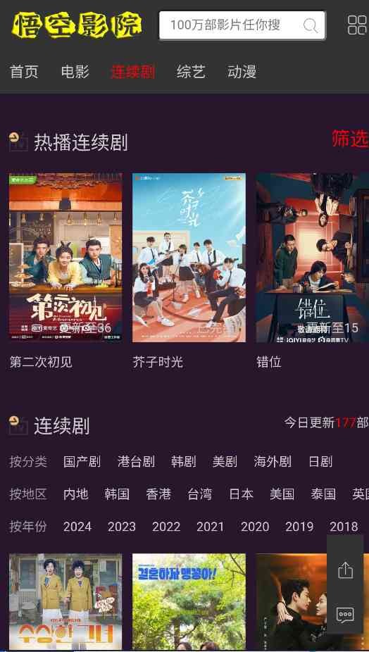 2、优化连续剧分类筛选,新增更多地区和年份选项
