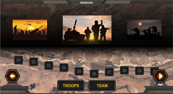 战区指挥官是一款战争策略指挥游戏,战场以2D俯视结构展开,兵种与载具构成核心战斗体系。战斗过程中需要调配步兵单位推进前线,同时安排坦克与装甲车进行火力压制,并在关键节点呼叫直升机与空中支援形成战术配合。不同兵种具备差异化作用,狙击单位负责远程清除目标,冲锋单位承担突进任务,装甲单位维持阵线稳定。随着战局推进,敌方强度逐步提升,需要根据战场变化调整部署节奏与进攻路线,通过持续调度完成区域占领目标并取得胜利。