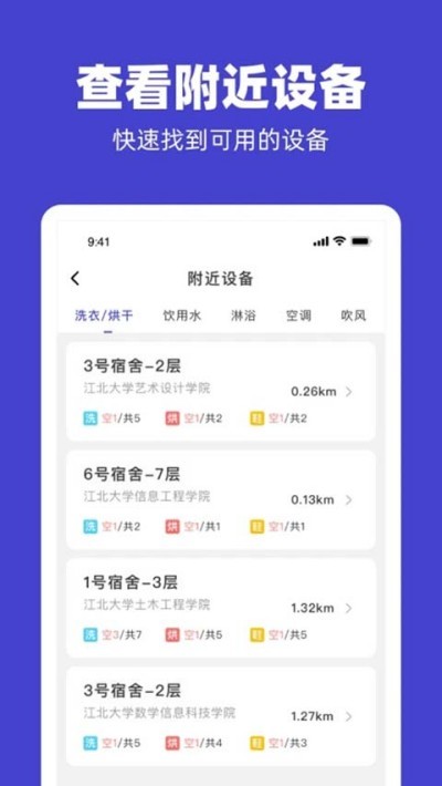 支持扫码绑定设备、区域主体绑定与周边设备检索,快速定位可用洗护设备,适配多类居住环境。