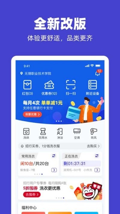 提供优惠券领取、红包查看等福利板块,支持凭证抵扣消费,降低日常洗衣使用成本。