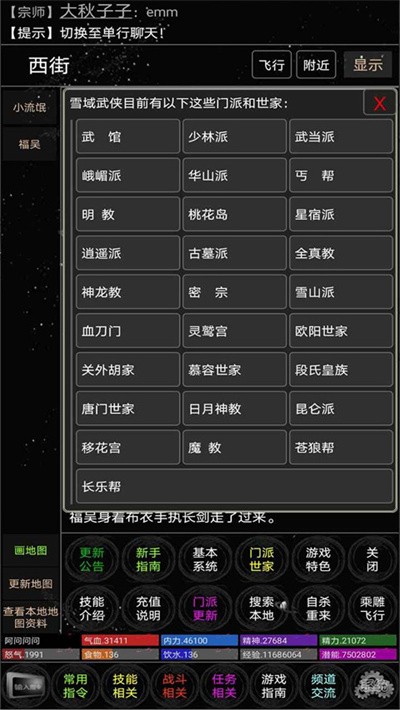 操作设计简洁直观,上手门槛低,即使碎片时间也能轻松体验江湖乐趣。同时内置完善的“游戏指南”系统,对各类玩法进行详细引导,让新手也能快速融入世界节奏。配合独特的文字画面表现与浓厚武侠氛围,《雪域江湖MUD》呈现出一个别具一格、耐人探索的武侠天地。