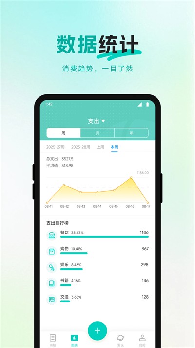 4、打开发现统计页面,一键查看当月整体收支结余与预算使用进度,了解剩余预算与本月支出详情,搭配资产管理板块,轻松打理日常全部个人财务流水。