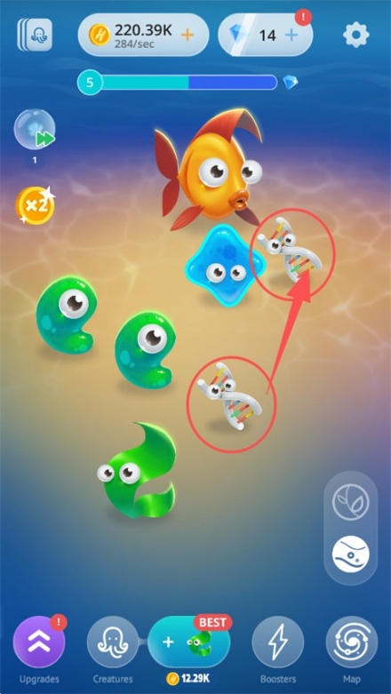 1、开局阶段优先进行基础合成,从DNA与单细胞开始逐步解锁鱼类阶段,通过早期进化积累第一波金币资源。
