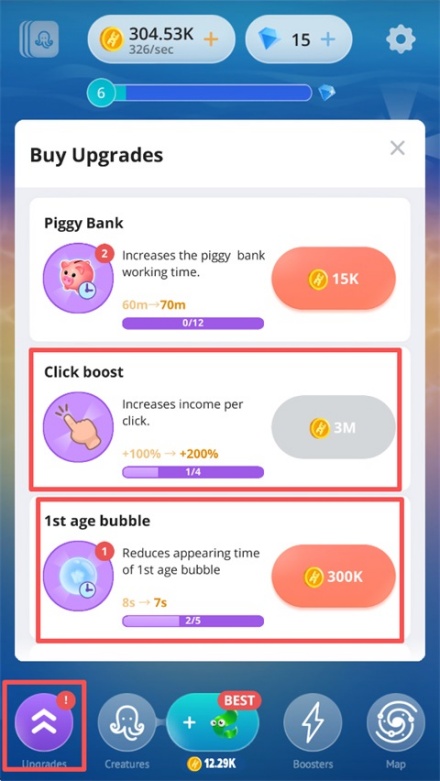 4、同步提升“Click boost”,增强每次点击收益,加快金币累积速度。