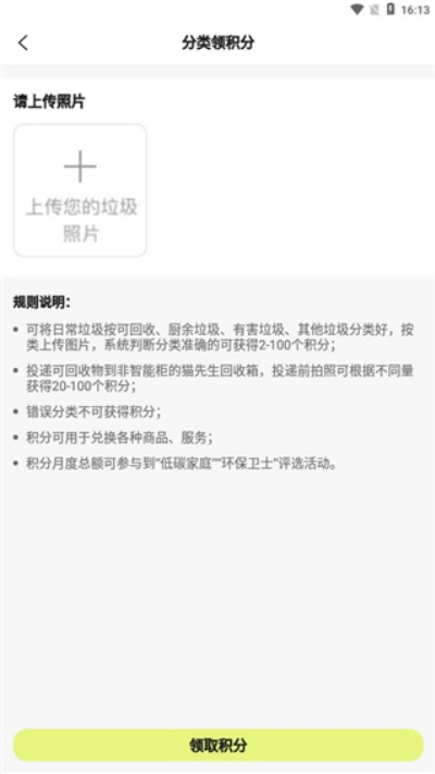 3、选择分类领积分功能,对垃圾进行分类并上传图片即可获得积分奖励。