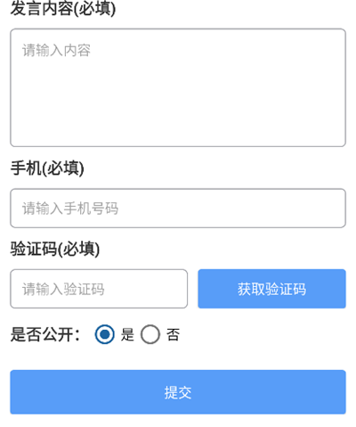 2、填写标题部门及发言内容获取验证码后提交等待审核发布。