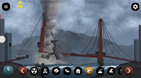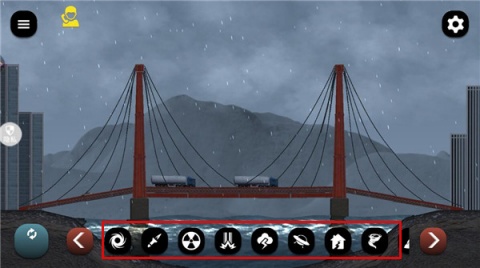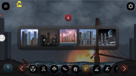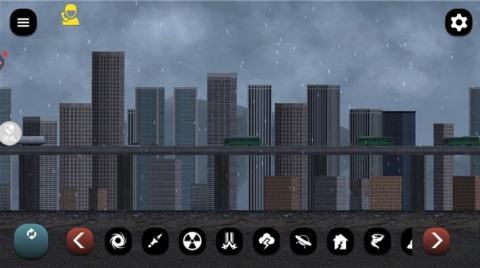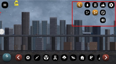 1、进入游戏后底部会显示多种灾害类型,包括龙卷风、地震、核爆与飞行装置等,可选择任意方式对场景进行破坏。