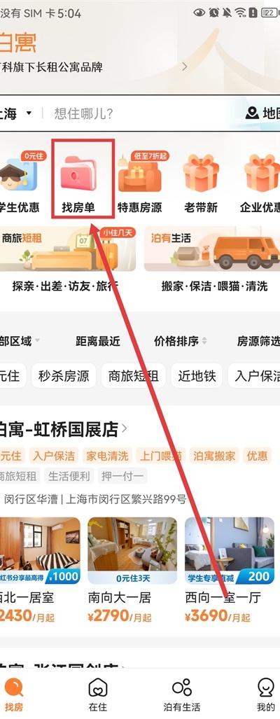 1、打开泊寓App,在首页进入“找房单”功能入口。