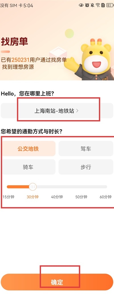 2、输入目标租房区域,并选择通勤方式与预计通勤时间。