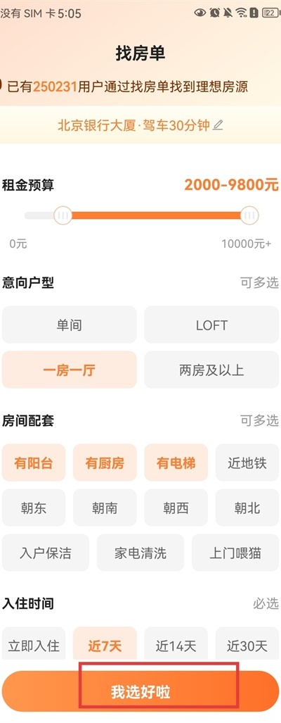 3、设置租金预算、户型需求及预计入住时间后点击确认。