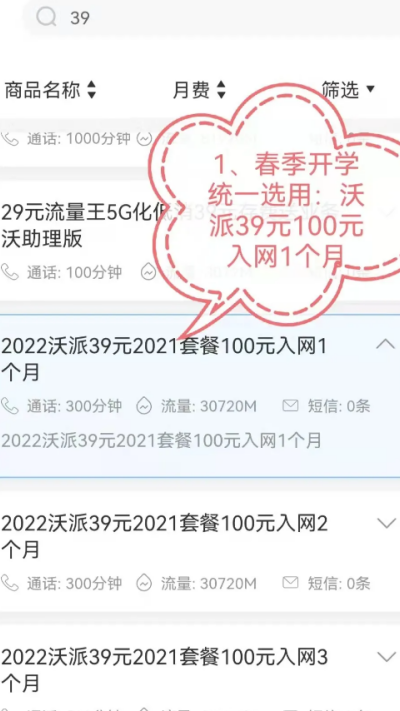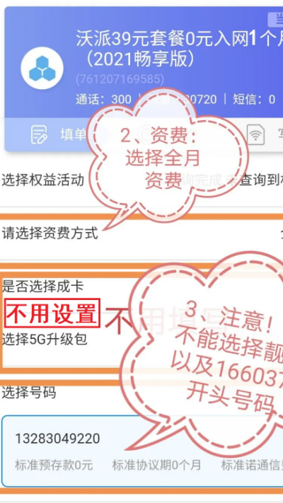 4、选择全月资费档位,避免选择靓号及1660378开头号码段。