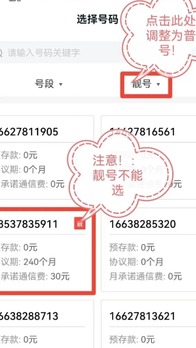 5、将号码类型调整为普号状态,确保靓号不可选用。