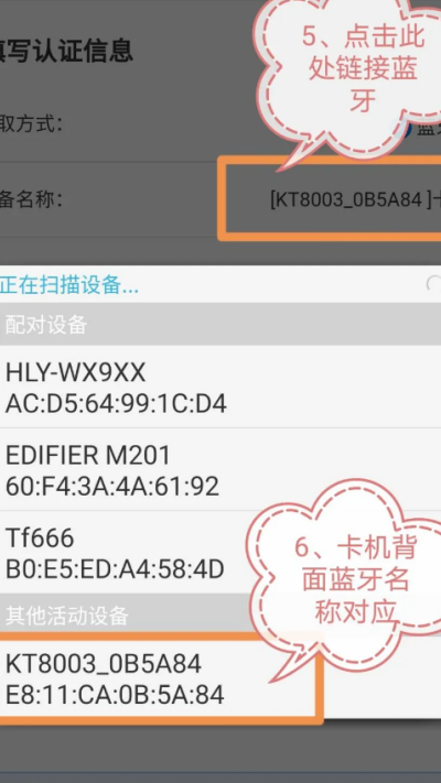 7、开启开卡器电源,通过手机蓝牙进行设备连接配。