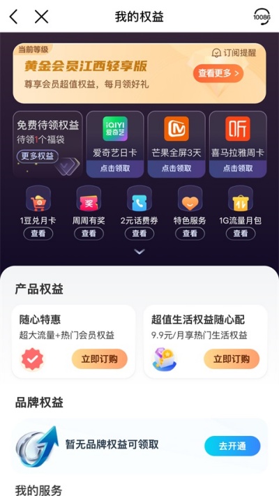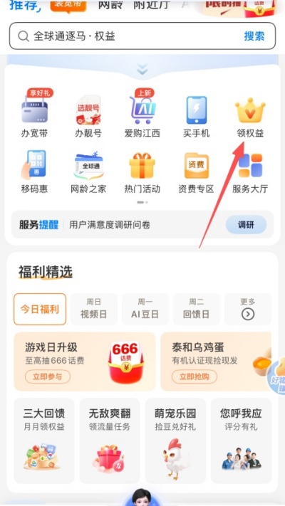 1、进入中国移动重庆App首页点击领权益入口进入活动页面。