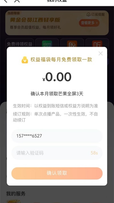 3、输入验证码完成身份验证即可成功领取对应权益服务内容。