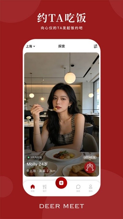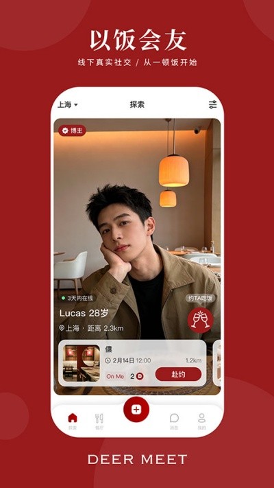 不同于传统社交工具,DeerMeet围绕“探索、预订、活动”构建完整社交路径:既可以快速匹配陌生人进行双人用餐,也支持熟人之间轻松组局,还能参与主题鲜明的特色饭局,满足多样化社交需求。系统基于饮食偏好、兴趣方向与地理位置进行智能匹配,大幅提升约饭成功率,多数邀约可在短时间内顺利落地。