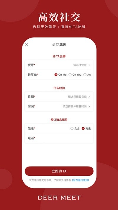 DeerMeet是一款以“吃饭社交”为核心理念打造的创新型应用,由遇鹿科技推出,主打真实、高效的线下互动体验。平台通过严格的人脸识别机制进行身份验证,从源头保障用户信息的真实性,有效减少虚假账号干扰,让每一次邀约更安心可靠。