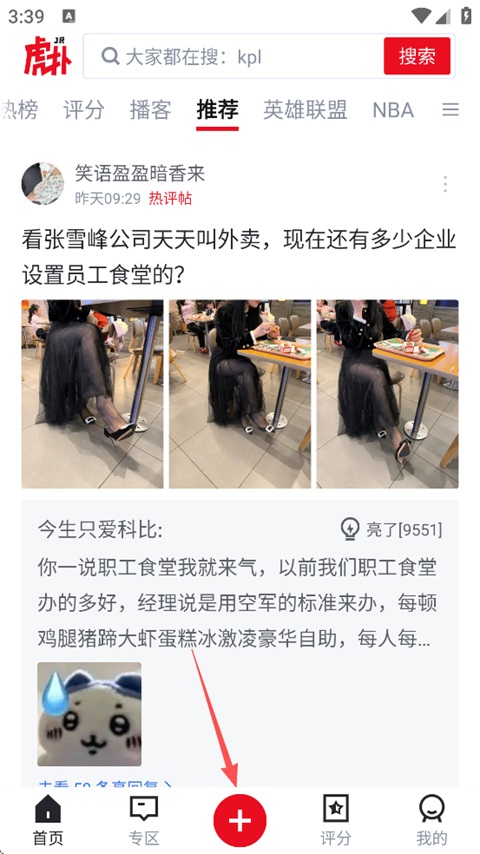 1、打开虎扑App后,在底部导航栏点击“+”进入发帖功能入口。