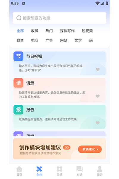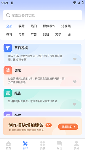 创作谷是一款功能全面、适用性广泛的全能ai助手,深度覆盖多元使用场景,无论是日常办公高效处理繁杂事务,还是创意构思、灵感文案创作,都能轻松胜任、高效完成。软件内置海量优质视频素材库、热门文案模板与创意灵感资源,种类丰富、分类齐全,无需额外搜集,随时为各类创作提供充足参考与素材支撑。依托强大的人工智能核心技术,搭载智能理解、逻辑梳理、内容生成、创意优化等多项进阶能力,可精准捕捉用户需求,快速输出高质量成果。凭借丰富的功能矩阵与广阔的应用范围,兼顾职场办公、自媒体创作、日常学习、兴趣创作等多种场景,以智能、便捷、高效的服务模式,全方位助力用户提升效率、激发创意,轻松应对各类内容产出与工作任务。