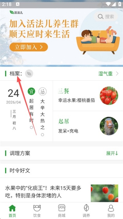 1、打开过日子App进入首页点击档案功能进入个人健康管理页面。