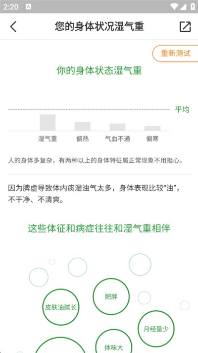 3、通过健康测试功能获取个人身体状态评估与分析结果。