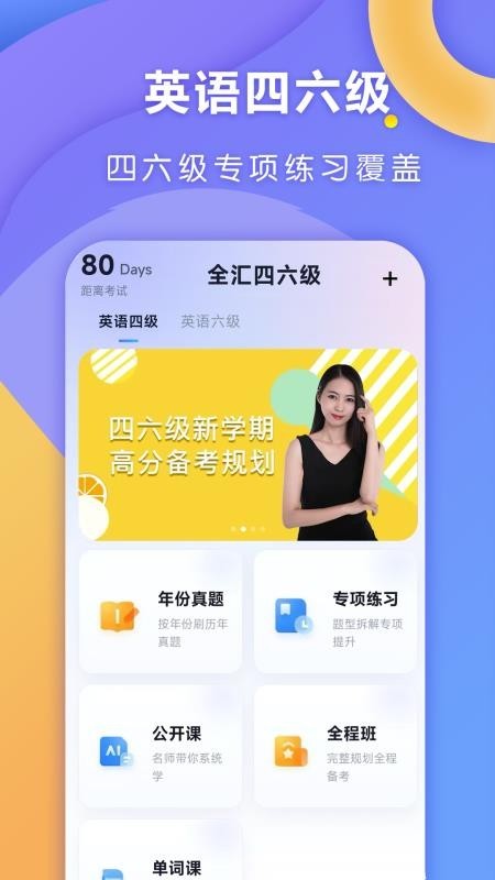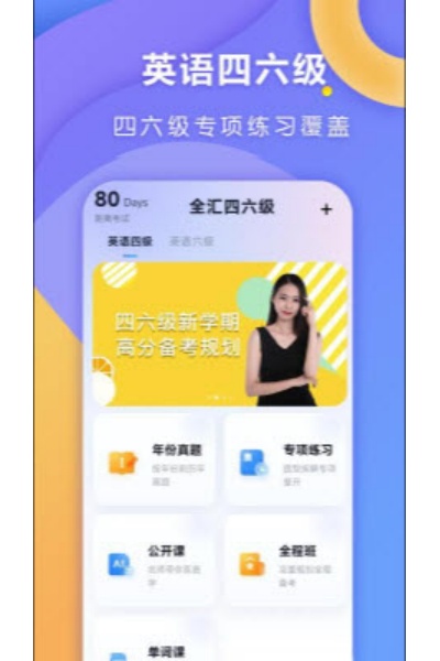 全汇四六级是专为大学英语四六级考生打造的在线英语学习软件,聚焦备考全流程,主打高效备考,覆盖背单词、刷真题、专项训练、名师技巧课、智能复盘等核心模块,全程免费使用。软件页面设计直观简洁,操作便捷,无论是零基础临时抱佛脚的考生,还是有基础想冲高分的学子,都能精准适配,助力用户高效提分、轻松备考。