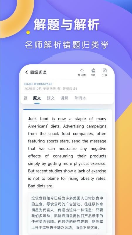 内置一键翻译工具,搭配长难句详细解析,考生遇到看不懂的句子,点击即可获取精准释义与语法拆解,快速提升阅读与翻译能力。