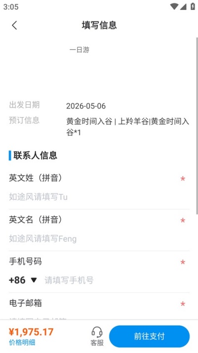 4、点击预订功能进入信息填写页面,录入游客资料并核对订单内容。