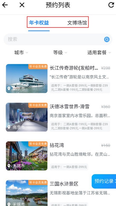 2、在列表中浏览可预约景点,根据年卡权益区分免费景点与付费景点,文博场馆仅限年卡用户预约。