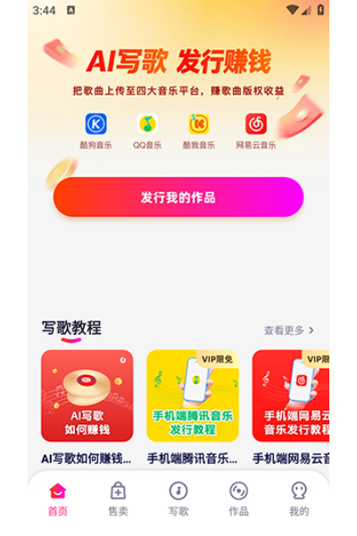 3、进入售卖页面,可出售个人原创音乐作品或购买心仪作品。回到首页,点击发行功能,将歌曲上传至四大音乐平台赚版权收益。