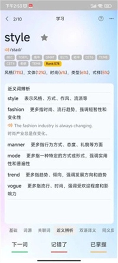 4、功能区提供词源用法、图文对照、常用短语、速刷模式等工具,满足不同学习习惯,助力高效攻克单词难关。