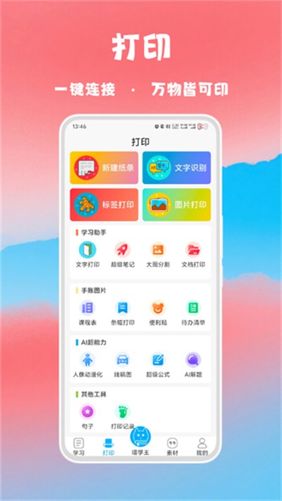 喵学王将课业辅导体系与便携打印能力相互结合,以轻量化操作解决错题整理、资料打印、素材积累等多样问题,极简的设备配对逻辑降低操作门槛,兼顾校内课业巩固、文字资料处理与日常趣味打印,打造实用性极强的学习生活两用辅助工具。