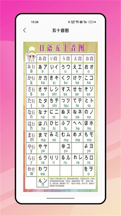 2、进入50音学习界面后,能看到完整的五十音表,每个假名都标注了平假名片假名和罗马音,可点击对应假名进入学习详情页面。