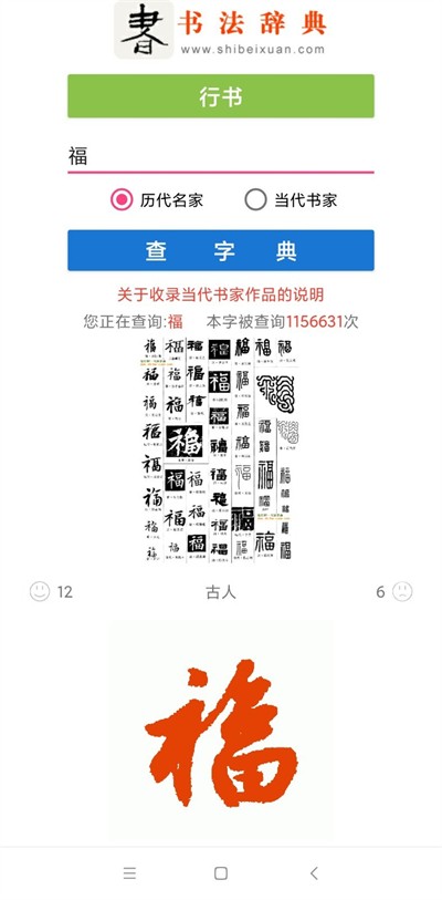2、查询汉字后,界面会显示该字的多种书法写法,包含不同书家的作品,还能看到该字的查询次数,也可点击分享本字给朋友。