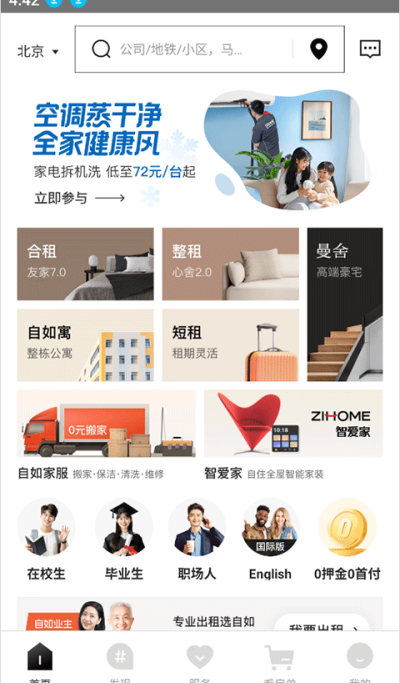 1、进入首页 打开自如租房app后根据租房需求选择对应类型进入房源浏览页面。