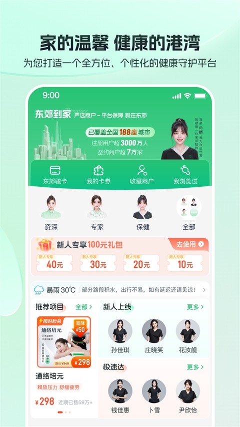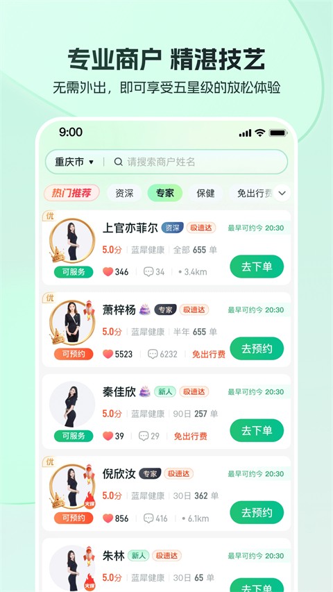 1、上门服务:用户可根据自身健康需求在线选择推拿按摩项目并直接预约上门服务,省去外出奔波时间,让专业理疗师在家即可提供舒适放松体验。