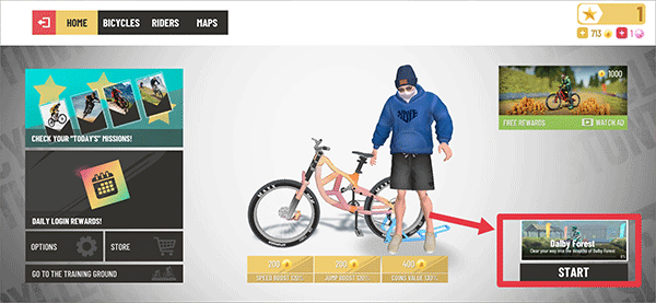 1、打开游戏后点击右下角“Start”按钮,即可进入游戏启动界面并准备开始骑行挑战流程。