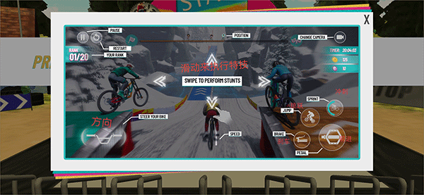 2、【特技操作系统】赛道中可完成多种自行车特技动作,如跳跃与翻转等,使比赛过程更具观赏性与操作挑战体验感受。