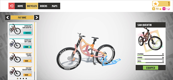 5、收集到的金币可在商城中购买不同类型自行车,不同车型在速度与属性方面会有明显差异表现。