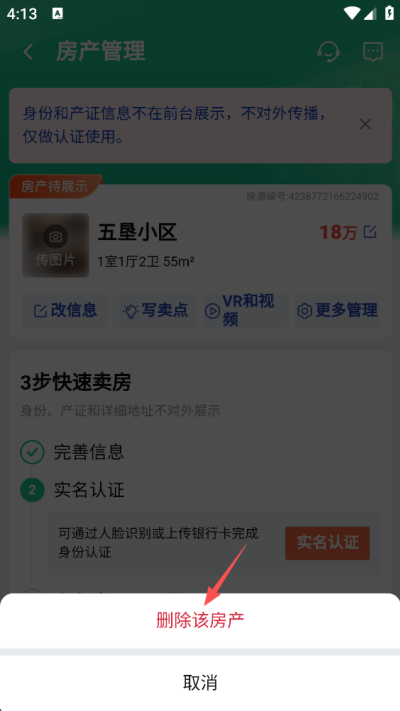 6、在功能菜单中选择“删除该房产”选项,进入删除确认与操作执行流程页面。
