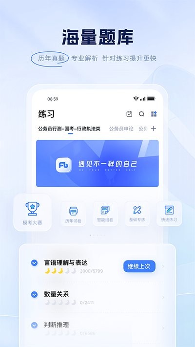 粉笔公考是一款公职考试备考类应用,围绕刷题训练与课程学习展开。进入后可根据目标职位进行方向选择,通过题库练习逐步掌握常见考点与解题思路。题目内容覆盖范围较广,适合长期进行阶段性练习。课程板块提供在线讲解形式,配合讲解节奏推进学习进度,减少单独刷题带来的重复感。练习过程中会根据做题情况进行分析,帮助明确薄弱方向,从而进行针对性提升。还设有模拟考试模块,还原真实考试节奏,便于提前适应考场环境。整体结构围绕练习、学习、检测三个环节展开,形成清晰备考路径,适合系统规划复习进度。