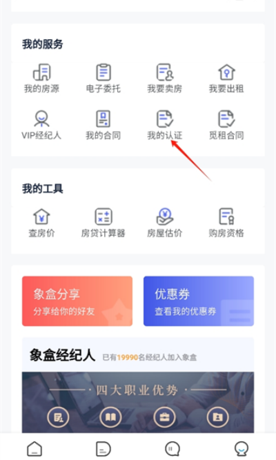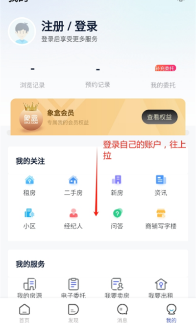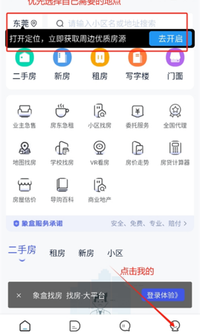 1、打开象盒找房App后选择所在城市或目标区域,进入首页后点击底部“我的”进入个人中心页面。