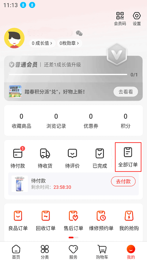 1、打开九机网App,在“我的”页面中找到并点击“全部订单”。