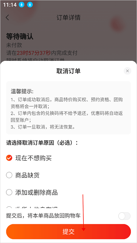 4、最后选择取消原因并提交,即可完成订单取消。