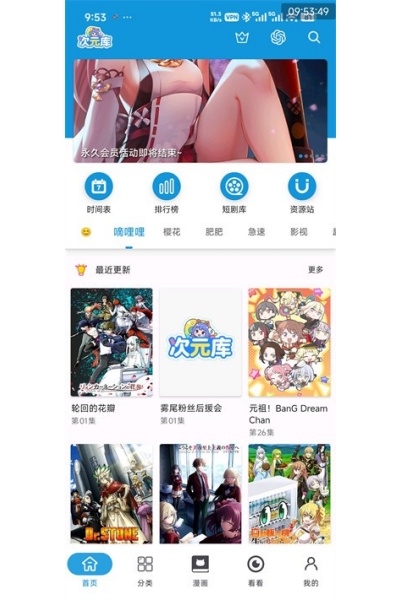 1、打开次元库App,首页可通过时间表、排行榜、搜索找到想看的动漫
