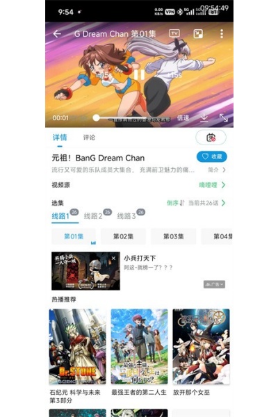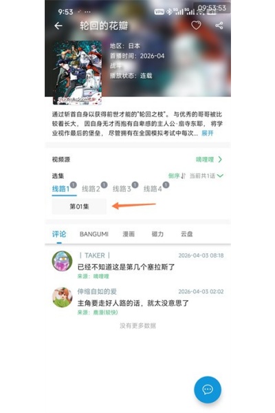 2、进入番剧详情页,可查看简介、选播放线路、逛评论,点01集进入观看