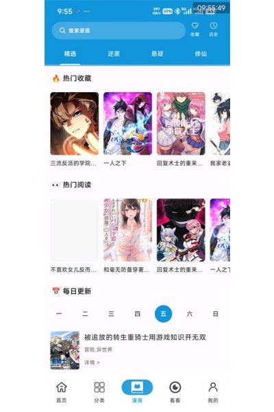 4、首页点击下方中间漫画界面,通过搜索、分类找到心仪漫画
